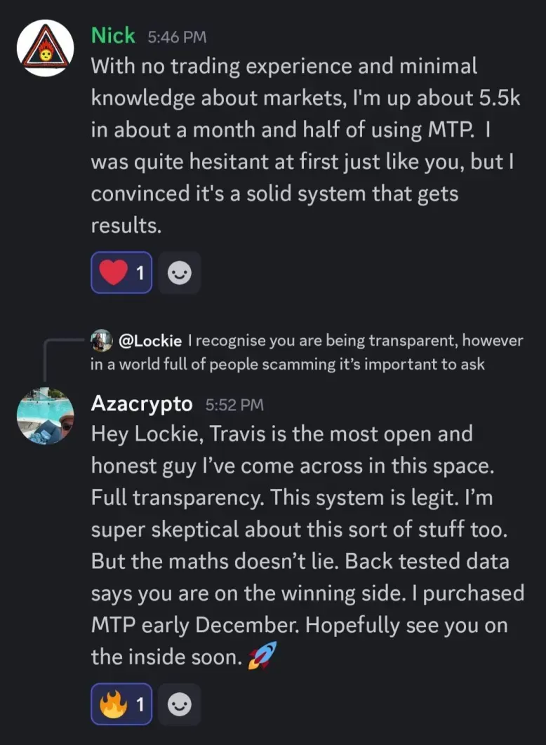 You’ll have direct access to Travis for fast answers, plus a supportive private Discord community of 100+ traders running the same system. You’ll never be trading alone.